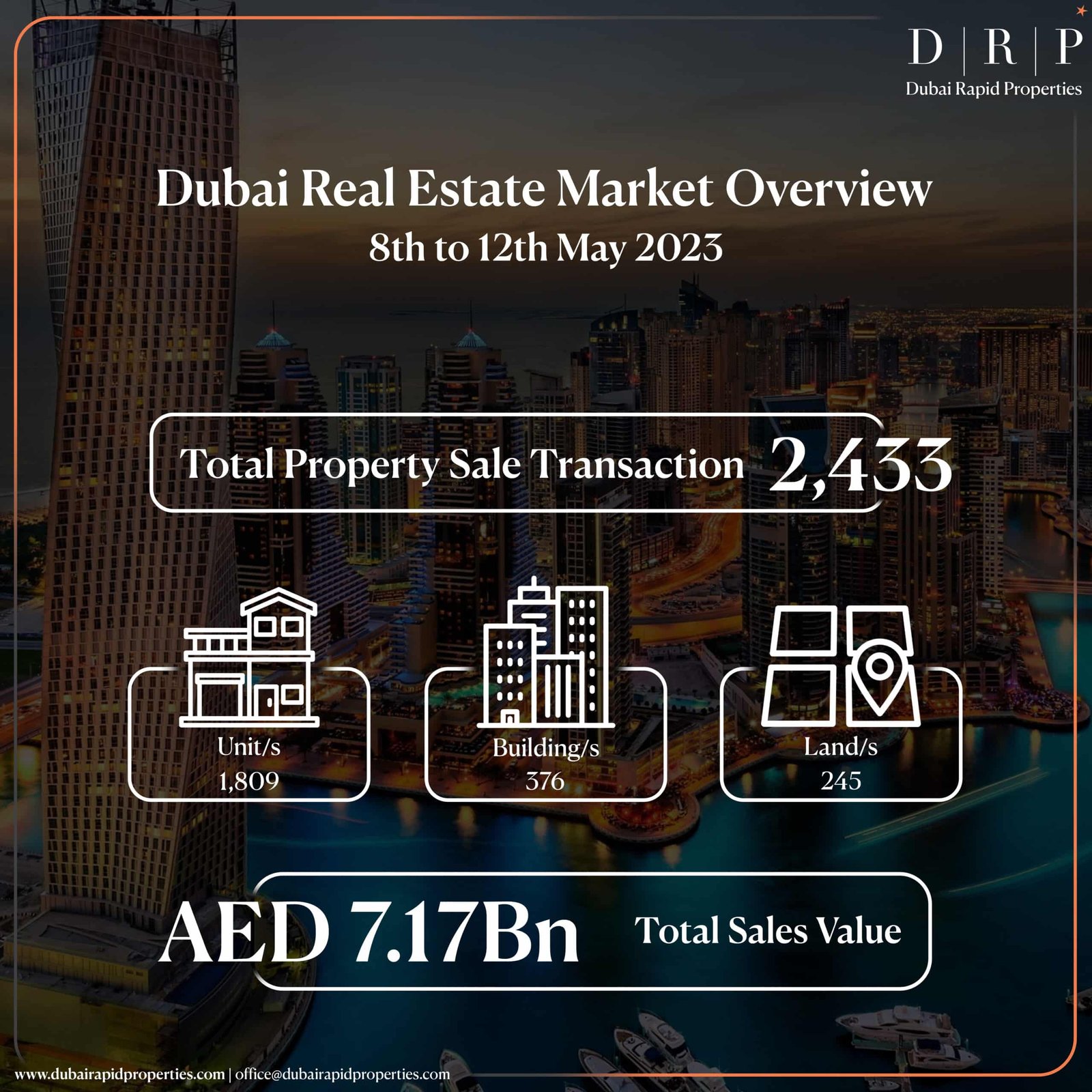 The Dubai Land Department (DLD) report from 8th to 12th May reveals an active real estate market with 2,433 transactions worth a staggering 7.17 billion. The report highlights the sale of 1,809 residential units, 376 buildings, and the transfer of 245 land parcels. These figures, obtained directly from the reliable data of the Dubai Land Department, provide valuable insights into the bustling real estate activity during this period.